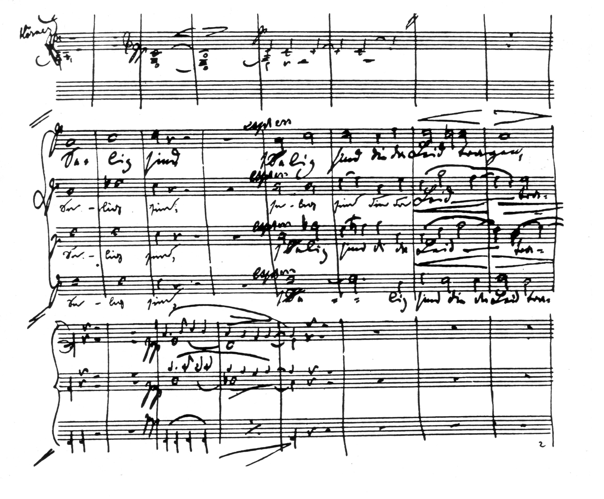 Selig sind, die da Leid tragen; denn sie sollen getröstet werden. [Blessed are they that mourn: for they shall be comforted. Matthew 5:4] ... Die mit Tränen säen, werden mit Freuden ernten. Sie gehen hin und weinen und tragen edlen Samen und kommen mit Freuden und bringen ihre Garben. [They that sow in tears shall reap in joy. He that goeth forth and weepeth, bearing precious seed, shall doubtless come again with rejoicing, bringing his sheaves with him. Psalm 126:5–6]